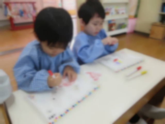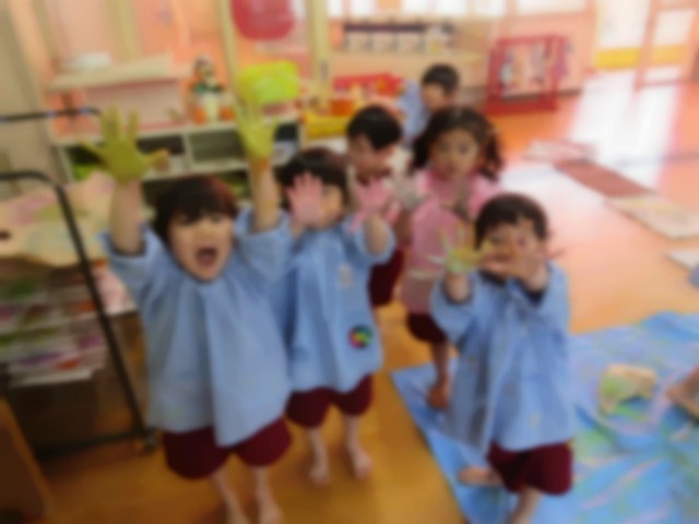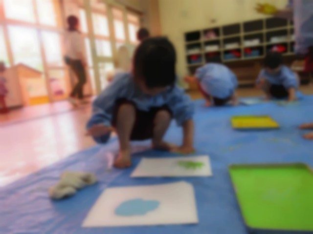 先週は絵の具で、手型ペッタン♪「冷たい~」「なんかくすぐったい」など、絵の具の感触を楽しみながら遊びました☆