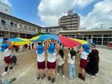 青組(5歳児)のパラバルーンの演技をみんなで見ました! パラバルーンが大きくふく...