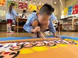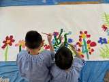 1枚の大きな紙に絵の具を使って友達と一緒に絵をかいて遊びました! 紙を長く伸ばす...