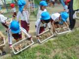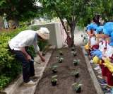 地域の方に教えていただき、玉出の伝統野菜「勝間南瓜(コツマナンキン)」の苗を植え...