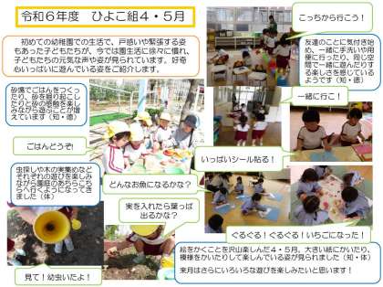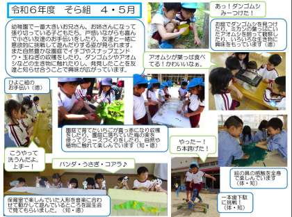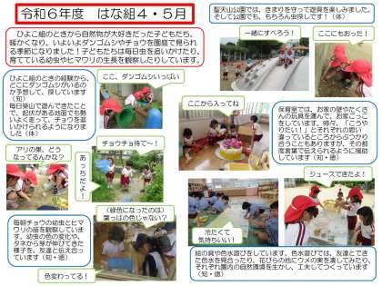 4・5月の子どもの姿 公開日 2024/06/05 更新日 2024/06/05 幼稚園日記 進級・入園して早2か月が経ちました。 4月・5月、新しいクラスや初めての園生活で最初は戸惑っていた子どもたちも、友達や先生と一緒に好きな遊びを見つけたり、園庭の自然や生き物に触れたりしていっぱい遊ぶうちに、安心して園生活を過ごすようになりました。この一年間の子どもたちの成長が楽しみです! いいね(0)