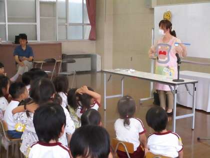 歯みがき指導・歯科講演会 公開日 2024/06/21 更新日 2024/06/21 幼稚園日記 6月20日(木) 子どもたち向けの歯みkがき指導では、歯科衛生士の先生のお話で“カバのかんちゃん”のエプロンシアターで楽しく歯みがきの大切さを学びました。 保護者向けの歯科講演会では、園医の原田先生より「間食のとり方」についてお話いただき、事前に保護者の皆さんから頂いていた質問に答えて頂きました。すぐに子どもたちに試してみたくなるお話で大変勉強になりました。 いいね(0)