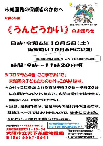 未就園児の方へ運動会のお知らせ 公開日 2024/09/27 更新日 2024/09/27 子育て支援・未就園児関係 10月5日(土)に大阪市立天下茶屋幼稚園の運動会があります。 プログラム4番「ここまでおいで」は、未就園の子どもたちのかけっこです。 ぜひ遊びに来てください♪ いいね(0)