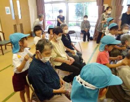 前に並んで「いつも見守ってくださってありがとうございます。」とお礼を伝えた後、一人一人にプレゼントをお渡しし、感謝の気持ちを込めて「とんとんとんとん肩たたき〜」と歌いながら肩たたきをしました。「嬉しいわ 涙出るわ」「ありがとうね」と言ってくださる姿もあり、とても喜んでくださっていることが子どもたちにも伝わっていました。