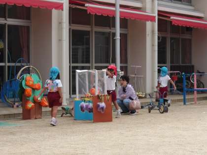 運動会で全園児で遊んだ“ミックスジュースをつくろう!”のミカン・イチゴ・ブドウを小さいお友だちと一緒に採ってジュース作りをしたり、砂場やなかよしの森でたくさん遊びました。
