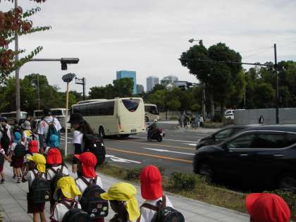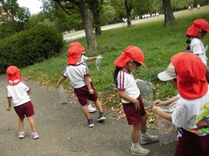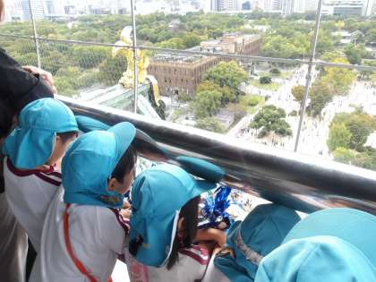 そら組(5歳児)の子どもたちが、大きな大阪城の天守閣に登って、大阪の街を見下ろすと、西の丸庭園でひよこ組・はな組の(3歳児・4歳児)子どもたちが遊んでいるのが見えたそうです。(「アリさんみたいに小さかった」そうですよ)