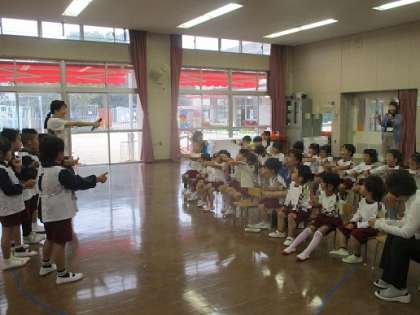 今日は、そら組(5歳児)の子どもたちが、小さいクラスの友達に向けて「うたごえひびけなにわっこ」で歌う歌を聞かせてくれました。『おいもごろごろ』を聞いた小さいクラスの子どもたちから「『おいもごろごろ』のグーのところがかっこよかった!」と話してくれました。そら組のお兄さんお姉さん達から改めて振り付けを教えてもらい、みんなで一緒に ♪おいもごろごろおいもグー♪と楽しく歌いました。