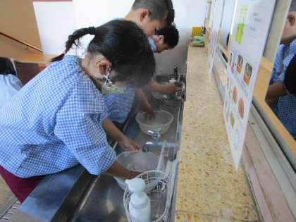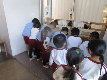ひよこ組(3歳)はその様子を見て、明日のもちつきのためにもち米を洗ってくれたお兄さんお姉さんに「ありがとう」を伝えました。