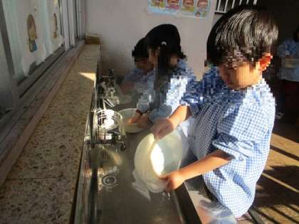 明日のもちつきのために、そら組(5歳児)とはな組(4歳児)は、もち米を洗ました。もち米をやさしく洗って、一粒も流さないように片手を添えてそっとお水を流し…。「ふかふかのもち米になりますように」と願いを込めて、何回か繰り返すと、白く濁っていたお水がきれいになり、きれいになったお米をバケツにまた一粒も落とさないようにうつしました。
