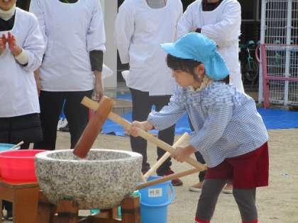 その蒸したてのもち米を石うすに移し、応援の子ども達の「よいしょー」の掛け声に合わせて力いっぱい重たい杵で餅をつきました。「よいしょー」ペタン。「よいしょー」ペタン。元気な声と餅をつく音が園庭に響き、とっても美味しそうなお餅がつけました。
