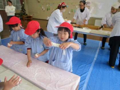 つきあがった出来立てのお餅でPTAの方が鏡餅を作ってくださる様子を見た後、子どもたちは伸ばしたり、丸めたり、匂いを嗅いだり…。「あったか〜い」「いいにおいでたべたーい」「やわらかーい」「びよーん、めっちゃのびる」と、みんな笑顔でおもちの感触を楽しみました。最後は、小さくちぎって丸めたお餅を切り枝に付け“餅花”を作り、日本の伝統文化に触れる一日でした。
