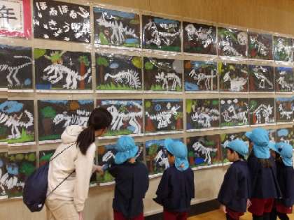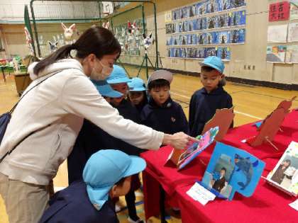 子どもたちは興味津々で「これは何だろう?」「どうやって作ったんかな…」というつぶやきが聞こえてきました。先生が小学生の書いたコメントを読むと、じっくり聞きながら、各学年の作品を一つ一つ丁寧に見て回りました。「これ、お兄ちゃんの!」「すごいね!」自分の兄姉や知っている友達の作品を嬉しそうに(自慢げに)また、憧れをもって見る姿も可愛かったです。