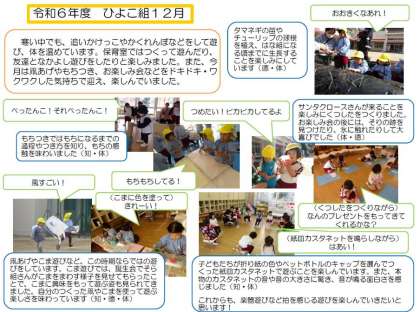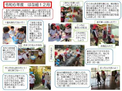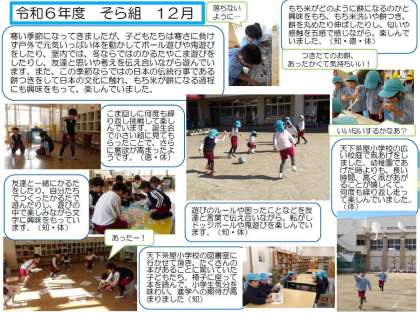 2学期の子どもの姿(4) 公開日 2024/12/27 更新日 2024/12/27 幼稚園日記 暑い8月に始まった2学期が無事に終わりました。 日々の遊びや運動会・展覧会などの行事を通して、子どもたちが大きく成長した2学期でした。 保護者の方、地域の方、いつも天下茶屋幼稚園を見守ってくださっている皆様、本当にありがとうございました。 また3学期もよろしくお願いいたします。 いいね(0)