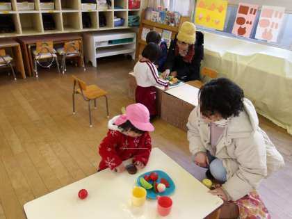 戸外遊びの後は、3歳児ひよこ組の部屋で遊びました。