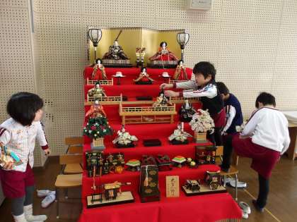 「これどこに置くんかな?」と見本の写真と見比べながら置く場所を考えたり、「お顔白いね!」と雛人形を見て触って発見したことを友達と先生と話したりして、日本の伝統文化に触れる大切な機会となりました。