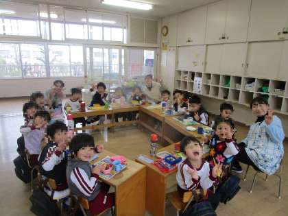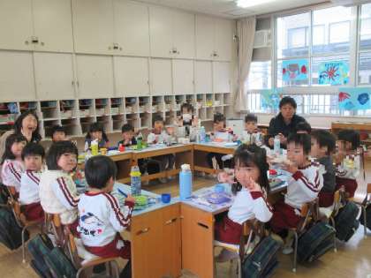 ペアで遠足に行ったり、遊んだりしていましたが、一緒に机を並べてお弁当を食べるのは初めての子どもたち。ドキドキした様子で準備をしていましたが、『お弁当のうた』を歌う頃にはとてもいい笑顔になっていました。