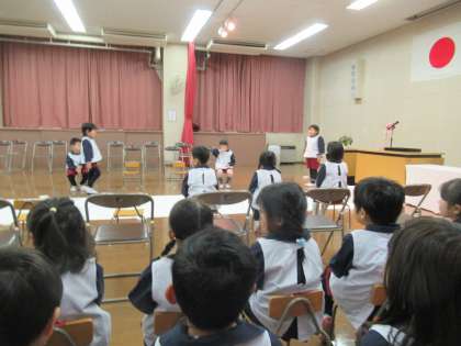 今日は全学年が遊戯室に集まり、修了式ごっこ(修了式予行)をしました。