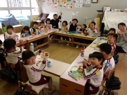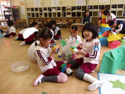修了式ごっこのあと、「おじゃましまーす!」の挨拶とともに、そら組(5歳児)がひよこ組(3歳児)のクラスに来て、一緒にお弁当を食べることしました。