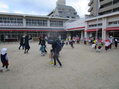 園庭で、お家の人やひよこ組(3歳児)、はな組(4歳児)と一緒に砂場でお山をつくったり、スクーターに乗って遊んだりして楽しく過ごしました。片付けをした後は、お家の人と一緒に、4月から使う幼稚園のトイレにも行きました。