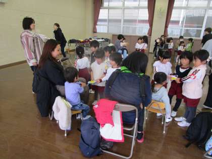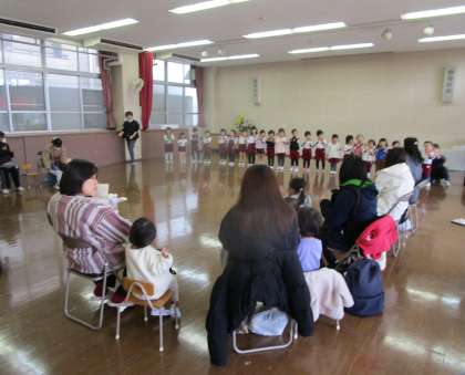 その後、遊戯室ではひよこ組とはな組が、「とんとんとんとん春が来た」の手遊びと「かわいいかくれんぼ」の歌を披露しました。お家の人と子どもたちで、遊んだり、歌ったりして楽しかったですね。最後に、「また遊ぼうね」の言葉と一緒に手作りメダルのプレゼントもありました。