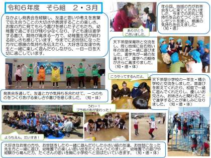 3学期の子どもの姿(2) 公開日 2025/03/25 更新日 2025/03/25 幼稚園日記 2・3月は、修了や進級に向けて、子どもたちの心の成長をとても感じることができました。 この1年間、心も身体も大きく成長した子どもたちです。 次年度はそれぞれの場所で、どんな成長を見せてくれるのか、とても楽しみにしています。 いいね(0)