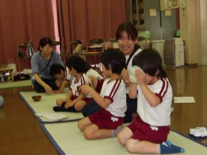 地域の方にお茶会の作法を教えていただき、お辞儀をしたり、「お先に」「どうぞ」とお友達に言ったりして、静かに座ってお菓子とお茶を楽しむひと時を過ごすことができました。
