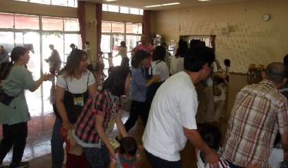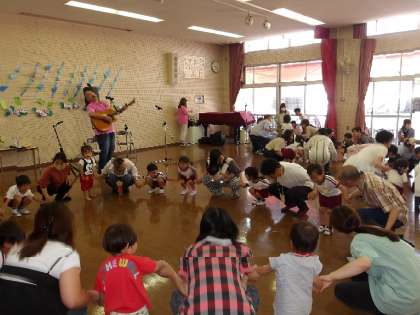 幼稚園の子どもたち、保護者の皆さん、そして、未就園児とその保護者の方も一緒に、まっちゃんの楽しい話と素敵な歌声、参加しているみんなで遊びました。