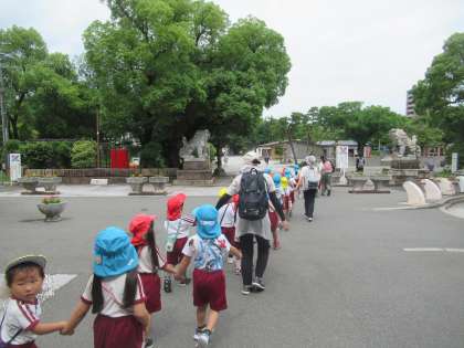 異年齢のペアの友達と手をつないで、電車や道路での交通ルールを守りながら住吉公園に向かいました。また、「電車何色やろ?」と乗ることを楽しみにしたり、「公園に着いたらいっぱい遊ぶねん!」とわくわくしたりして友達と話す姿も見られました。