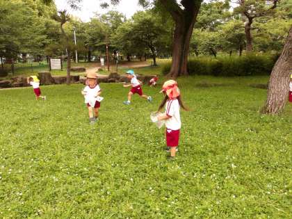 公園に到着し、きれいなシロツメクサが咲いている場所で遊ぶことにしました。子どもたちは、シロツメクサを腕や指に巻き付けて遊んだり、小川に草でつくった舟を流してみたり、チョウチョウを見つけて捕まえたり、自然に触れながら楽しい遊びを見つけて過ごしました。