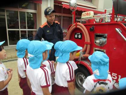 「先生の話をよく聞いて、早く避難していましたね!」とお褒めの言葉もいただきました。お話の後は、消火器の使い方を教えていただいたり、消防車を間近で見せてもらったりしました。