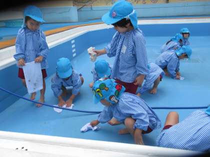 そら組(5歳児)の子どもたちが、みんなが楽しく遊べるようにプールの掃除をしてくれていました!雑巾を絞って、ゴシゴシこすって…プールがピカピカきれいになりました。