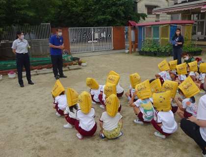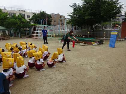 4月に火災、5月には地震を想定した訓練の経験があったので、子どもたちは落ち着いて、防災頭巾をかぶったり、ハンカチで口と鼻を抑えたりして避難することができていました。