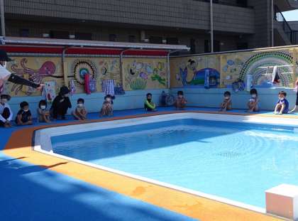 今日もとってもいいお天気の中、はな組とひよこ組の子どもたちのプール開きをしました。