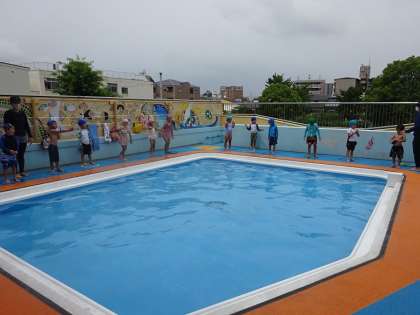 そら組は幼稚園最後のプール遊びでした。洗濯機ごっこでうきわ・ロープくぐり・宝探し・トンネルくぐり、たっぷりとプール遊びを堪能して楽しみました。最後に、プールサイドに並んで「プールくん、あそんでくれてありがとう」と、プールに感謝の気持ちを伝えて終りました。
