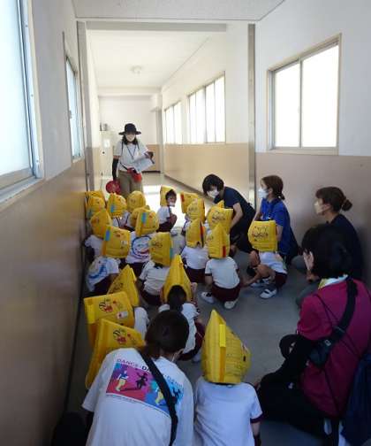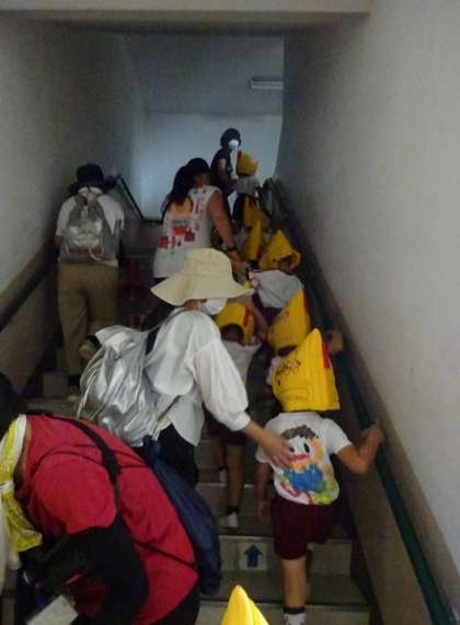小学校での避難訓練は初めてでしたが、子どもたちは落ち着いて行動し、慣れない階段を一生懸命のぼって、3階まで無事避難することができました。