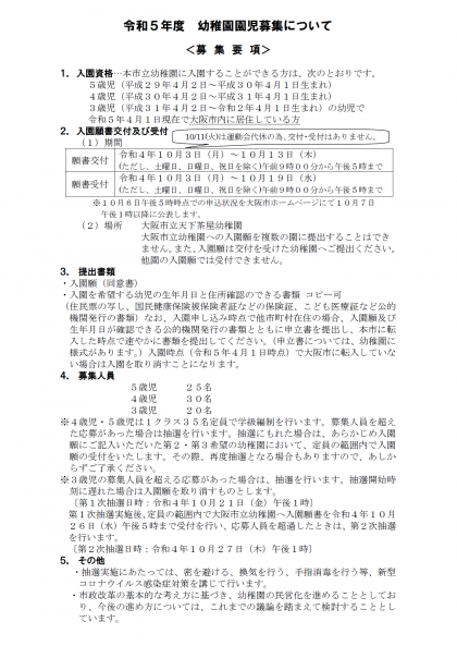 令和5年度の園児募集について 公開日 2022/09/22 更新日 2022/09/22 子育て支援・未就園児関係 令和5年度の園児募集について、募集要項を掲載いたします。 10月3日から入園願書の交付・受付が始まりますので、ぜひお越しください。お待ちしています。 いいね(0)