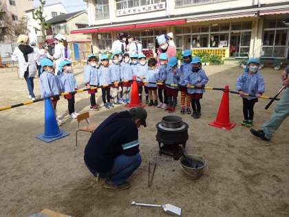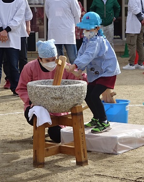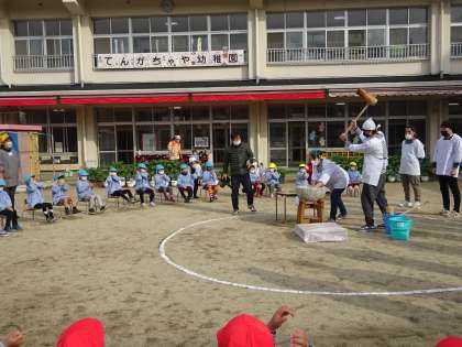 コロナ禍で中止していたPTA主催の餅つきを、たくさんの方の協力で、全園児参加で実施することができました。登園してきた子どもたちは「なんか焦げたにおいする・・・」とかまどの中で薪に火がついている様子に興味津々でした。朝の身支度を終えて、みんなで園庭に集まり、餅つきが始まりました。もち米が蒸しあがり、いい匂いがして、つく前の蒸したお米の匂いを嗅ぐと「あったかいあじする!」「お餅のにおいや」など初めての体験を嬉しそうに話してくれました。お手伝いの地域の方や保護者が順番についてくださる姿に合わせて、子どもたちの「よししょ!」の掛け声。つやつやのお餅がつきあがりました。餅丸めでは、温かく柔らかいお餅に大喜びでびよーんと伸ばしたり、くるくる丸めたり、小さくちぎったりと、もちもちした感触を存分に楽しんだ後は餅花にして飾りました。子どもたち、お手伝いの方、教職員みんなが笑顔になる楽しいひと時でした。