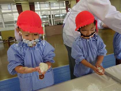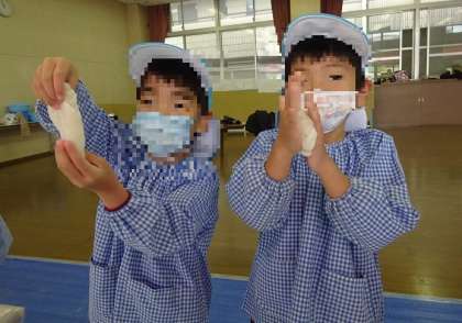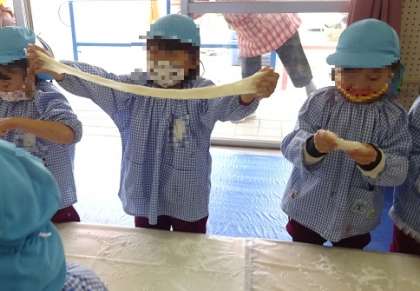 「お餅あったか〜い」「気持ちいい〜」「こんなに伸びたー!」と言いながらお餅をちぎったり丸めたりし、つきたてのお餅の感触を存分に楽しみました。
