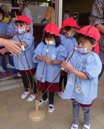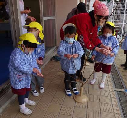 幼稚園の庭にあるケヤキの木を事業担当主事さんが切ってくださり、その枝に、ちぎったお餅を子どもたちが丁寧にくっつけて、餅花にしました。