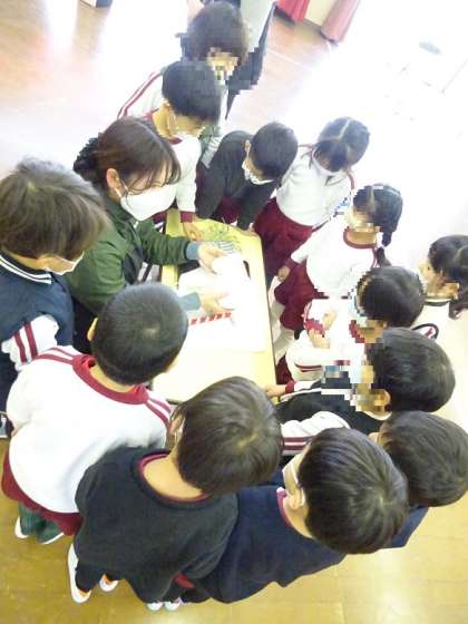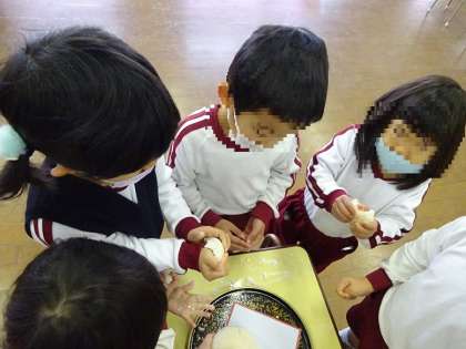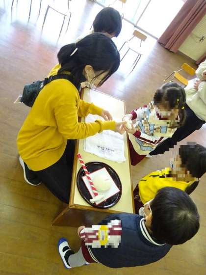 鏡開き2 公開日 2023/01/12 更新日 2023/01/12 幼稚園日記 先生たちのあとに、今度は子どもたちが各クラスに飾っていた鏡餅の鏡開きをしました。 お餅つきの時には、あんなに柔らかかったお餅が固くなっていることに気付き、苦労しながらも、子どもたちは力を入れてどんどん手で開いていったり、みんなが元気に幸せに暮らせますようにとお願いしたりしました。 今後も子どもたちが日本の伝承行事に興味をもち、大切に思う気持ちが育つよう、保育に取り入れていきたいです。 いいね(0)