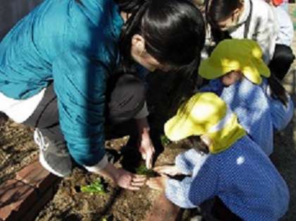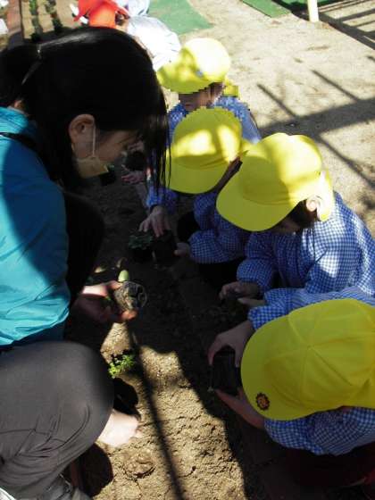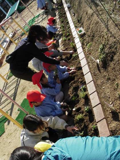 3歳児ひよこ組・4歳児はな組の子どもたちで幼稚園の花壇に植えました。