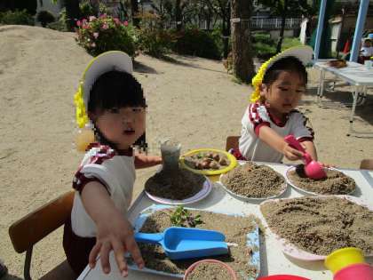 砂場でごちそうをたくさんつくったり、お花で遊んだり、三輪車に乗ったり、ウサギのココアちゃんに草をあげたり…