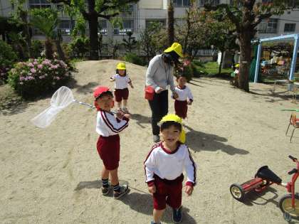 今日はぽかぽかのいいお天気の中、広い園庭でたくさん遊びました。