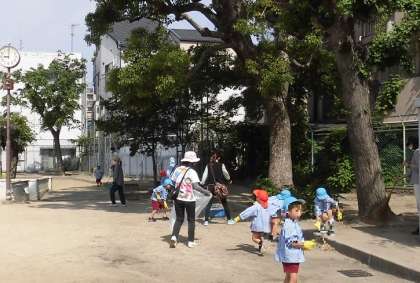 地域の方や天下茶屋小学校のお兄さん、お姉さんがいつも清掃してくださっている北天下茶屋公園。今日はそら組・はな組の子どもたちがお家の方と一緒に今年度初めて行いました。「ごみはごみ箱にいれなあかんねんな!」と話しながら、ごみや危ないガラス片を見つけ、きれいにしてくれました。昨年よりも清掃用具の使い方が上手になっていることや小さなごみも見つけられるようになっている姿が見られ、一年の経験が積み重なっていることを感じました。