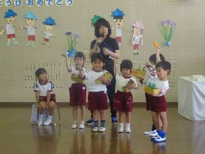 5月生まれの誕生会をしました。誕生児は、お友達からの手作りプレゼントをもらったり、園長先生からも素敵なプレゼントをいただきました。