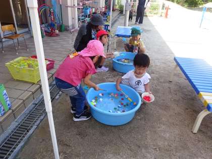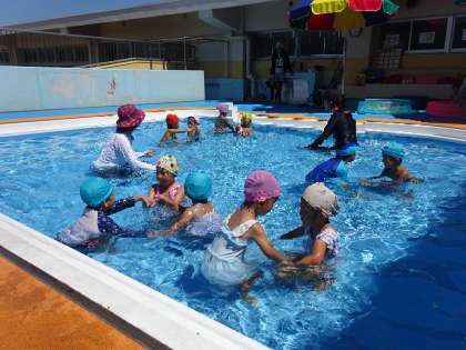 プールでは、異年齢の子どもたちが一緒にプールに入って、水の中でなかよし遊びも楽しんでいました。