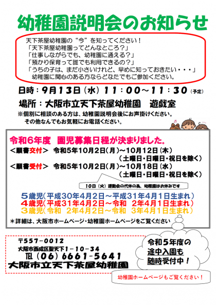 幼稚園に来て、見て、聞いて、天下茶屋幼稚園がどんなところなのか、知っていただけたらと思います。