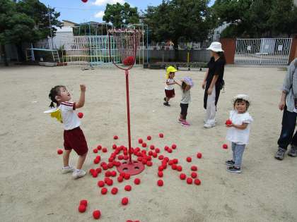 玉入れをしたり、ぱかぽこをしたり、一本歯下駄をしたり、お兄ちゃん、お姉ちゃんが楽しそうに遊んでいる姿を見て、真似っこしていろいろな遊びをやってみようとする小さなお友達。