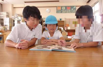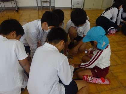 30分ほどの長い道のりを歩いて、初めて橘小学校に入った子どもたち。最初はドキドキした様子でしたが、5年生のお兄さん・お姉さんがいろいろな楽しい活動を用意してくださっており、優しく声をかけてもらいながら一緒に遊ぶうちに、子どもたちはどんどん心を開いていきました。製作や楽器遊びを手伝ってもらいながら一緒に楽しんだり、絵本の読み聞かせをしてもらったりしました。また、広い校舎内のいろいろな教室を手をつないで移動することも、まるで探検のようで、子どもたちにとってはとっても楽しかったようです。