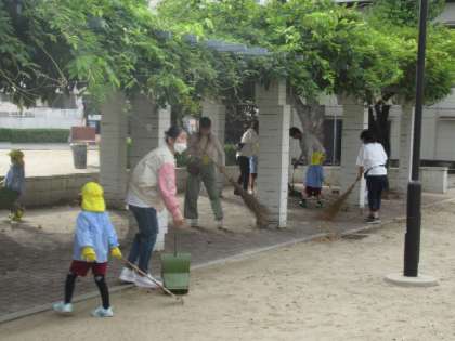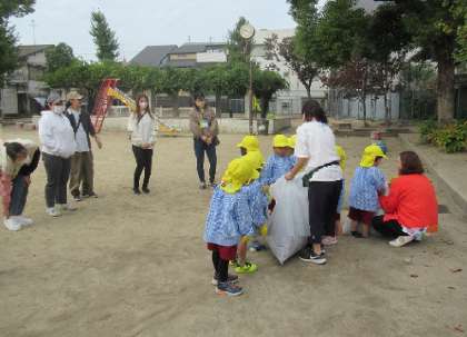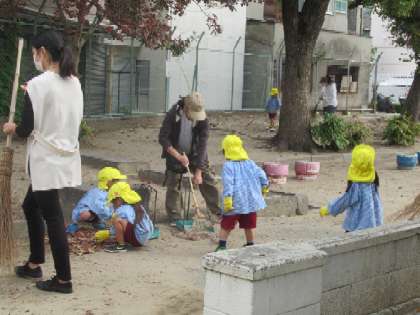 今日は ひよこ組(3歳児)の子どもたちとおうちの方で一緒に、幼稚園に隣接する北天下茶屋公園の清掃をしました。